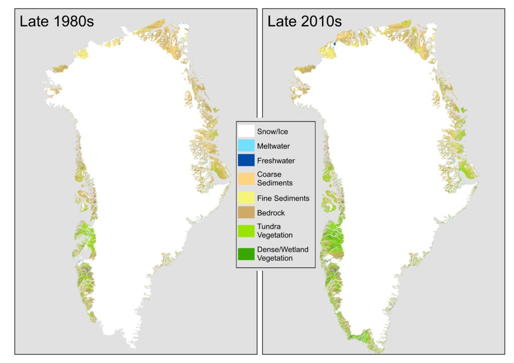 Εκτιμάται ότι περισσότερα από 28.700 τετραγωνικά χιλιόμετρα ή το 1,6% του στρώματος πάγου και των παγετώνων της Γροιλανδίας έχουν λιώσει τις τελευταίες τρεις δεκαετίες δίνοντας τη θέση τους σε βράχους, υγροτόπους και θάμνους, όπως προκύπτει από μια μεγάλη ανάλυση ιστορικών δορυφορικών αρχείων.