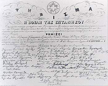 Ολα αυτά τα χρόνια γίνονται πολλές προσπάθειες από τους Επτανήσιους για ανεξαρτητοποίηση των νησιών και ένωση τους με την υπόλοιπη (απελευθερωμένη από το 1827) Ελλάδα. Τελικά το 1863 υπογράφτηκε στο Λονδίνο συνθήκη των μεγάλων δυνάμεων σύμφωνα με την οποία η Αγγλία παραιτείται από την προστασία των Ιόνιων νήσων.