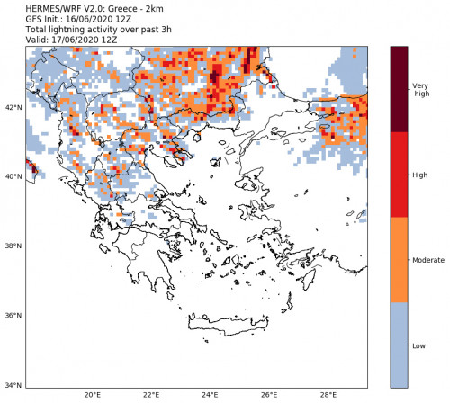 Όπως προκύπτει από τον ενδεικτικό χάρτη που ακολουθεί και παρουσιάζει την κεραυνική δραστηριότητα το μεσημέρι της Τετάρτης, έντονη κεραυνική δραστηριότητα αναμένουμε κυρίως στα κεντρικά και βόρεια ηπειρωτικά.