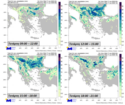 Τα φαινόμενα που θα είναι κατά τόπους ισχυρά και σε κάποιες περιπτώσεις θα συνοδεύονται ενδεχομένως από χαλαζοπτώσεις, θα εξασθενήσουν προς το τέλος του εικοσιτετραώρου. Στους χάρτες που ακολουθούν παρουσιάζεται τον ολικό υετό που αναμένουμε ανά 3ωρο έως το βράδυ της Τετάρτης.
