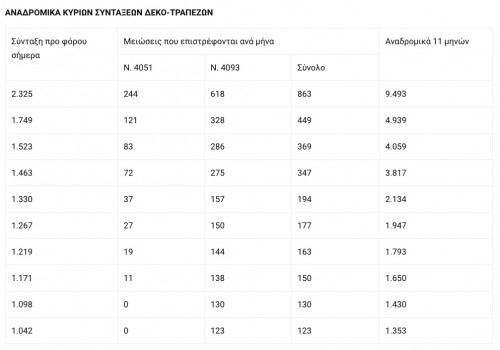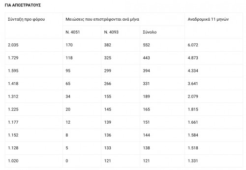 Κρατήσεις ν.4051/2012 από 7/2015 έως 5/2016 : 37,77€ επί 11 μήνες = 415,47 €. Κρατήσεις ν.4093/2012 από 7/2015 έως 5/2016: 157,70€ επί 11 μήνες = 1.734,7 €.Ο εν λόγω συνταξιούχος αναμένει επιστροφή ύψους 2.150,17€