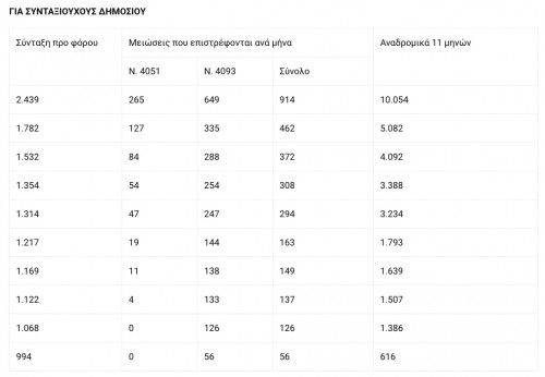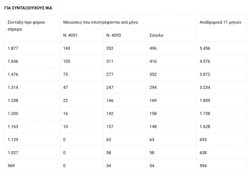 Το ύψος των επιστροφών κυμαίνεται από 550 έως 7.200 ευρώ, μεικτά, μεσοσταθμικά 900 με 1.000 ευρώ. Έτσι για παράδειγμα συνταξιούχος του ΙΚΑ με κύρια σύνταξη 1828 ευρώ είχε τις εξής περικοπές.