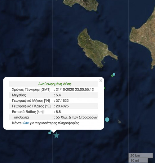 Στις 2 π.μ. σεισμός 4,5 Ρίχτερ καταγράφηκε 49 χιλιόμετρα δυτικά των Στροφάδων και σαράντα δευτερόλεπτα αργότερα, ακολούθησε 5,4 βαθμών της κλίμακας Ρίχτερ, με επίκεντρο 55 χιλιόμετρα δυτικά των Στροφάδων.