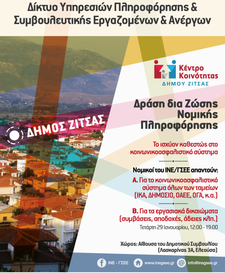 Ειδικότερα, το Κέντρο Κοινότητας του Δήμου Ζίτσας σε συνεργασία με το Ινστιτούτο Εργασίας της Γ.Σ.Ε.Ε (ΙΝ.Ε Γ.Σ.Ε.Ε) διοργανώνουν στην Αίθουσα του Δημοτικού Συμβουλίου (Λασκαρίνας 3Α, Ελεούσα) την Τετάρτη 29 Ιανουαρίου 2020, από τις 12:00 έως τις 19:00, εκδήλωση όπου εξειδικευμένοι νομικοί θα δίνουν ΔΩΡΕΑΝ απαντήσεις σε ΑΤΟΜΙΚΑ ερωτήματα και προβληματισμούς εργαζομένων και ανέργων σχετικά με: