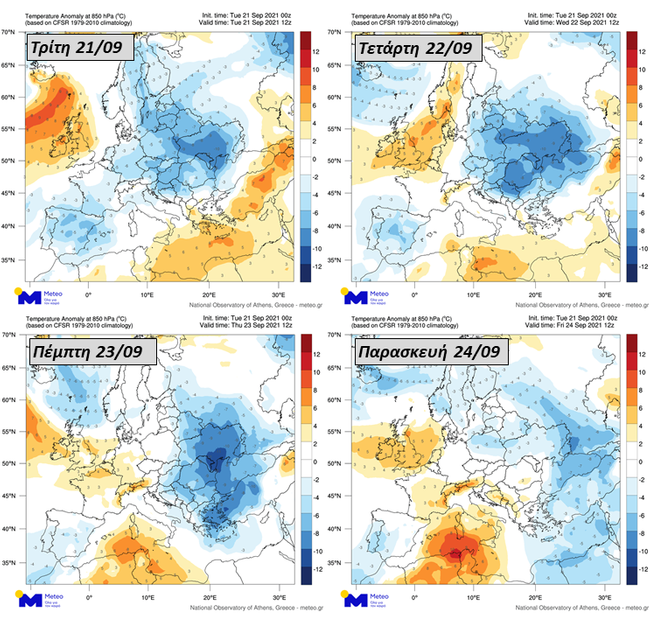 Στην παρακάτω ομάδα χαρτών, παρουσιάζονται οι αποκλίσεις της θερμοκρασίας από την κλιματική τιμή της στο επίπεδο των 850 hPa (περίπου 1500 μέτρα από την επιφάνεια), στην περιοχή της Ευρώπης, για τις μεσημεριανές ώρες των επόμενων 4 ημερών. Το επίπεδο των 850 hPa χρησιμοποιείται για τη μελέτη της κίνησης των αερίων μαζών στα χαμηλότερα στρώματα της ατμόσφαιρας.