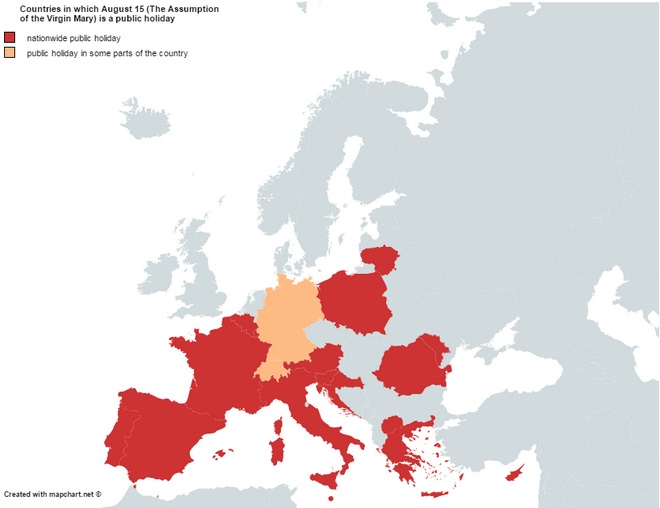 Γιορτή και αργία, πάντως, είναι σε όλη τη Γαλλία, την Ιταλία, την Ισπανία, την Πορτογαλία, το Βέλγιο, την Κροατία, τη Σλοβενία, την Αυστρία, την Πολωνία, το Λιχτενστάιν, το Λουξεμβούργο, και τη Μάλτα.