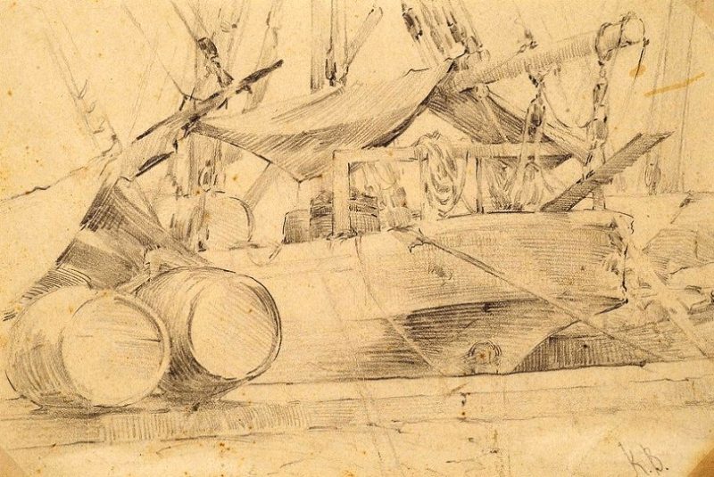 Στην Τεργέστη στο μεγάλο οίκο εμπορίας ζαχάρεως Αφεντούλη ένα νεαρός λογιστής αντί για καταχωρίσεις σε χοντρά λογιστικά βιβλία προτιμούσε να κάνει σκίτσα με βάρκες, πλοία και λιμάνια.