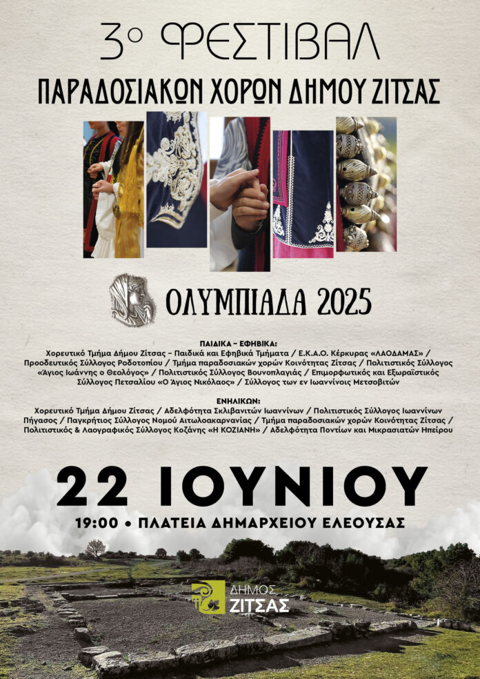 Με τη συμμετοχή χορευτικών τμημάτων από συλλόγους και εντός του δήμου Ζίτσας και εκτός αυτού ακόμη όμως και από άλλες περιοχές της χώρας, πραγματοποιείται την Κυριακή 22 Ιουνίου στις 19.00 στην πλατεία δημαρχείου στην Ελεούσα το 3ο Φεστιβάλ Παραδοσιακών Χορών.