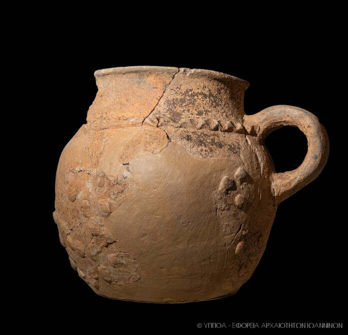 Τμήμα χειροποίητου αγγείου με λαβή, διακοσμημένο με επίθετα δισκάρια, από την Κρύα Ιωαννίνων. Το αγγείο, το οποίο έχει εν μέρει συμπληρωθεί σημειακά, χρονολογείται στην Ύστερη Εποχή Χαλκού/Πρώιμη Εποχή Σιδήρου (περ. 1.100 – 900 π.Χ.). Ανήκε στον οικιακό εξοπλισμό γεωργοκτηνοτρόφων στον περίγυρο της λίμνης Παμβώτιδας.