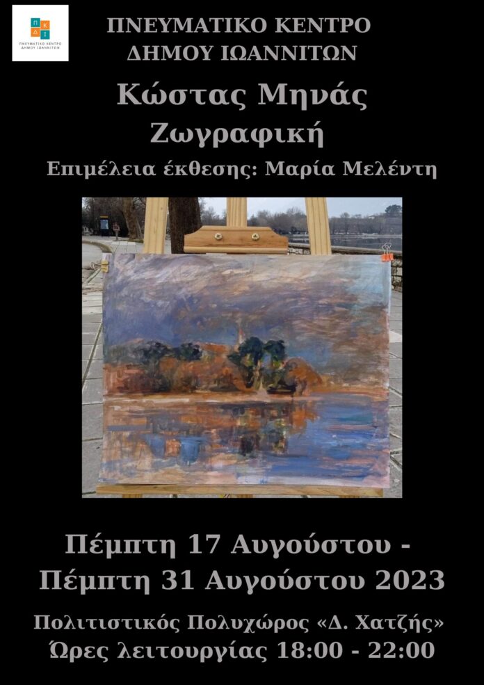 Το Πνευματικό Κέντρο του Δήμου Ιωαννιτών παρουσιάζει από την Πέμπτη 17 Αυγούστου έως την Πέμπτη 31 Αυγούστου, στον Εκθεσιακό Χώρο του Πολιτιστικού Πολυχώρου «Δ. Χατζής», έκθεση ζωγραφικής με έργα του Κώστα Μηνά.