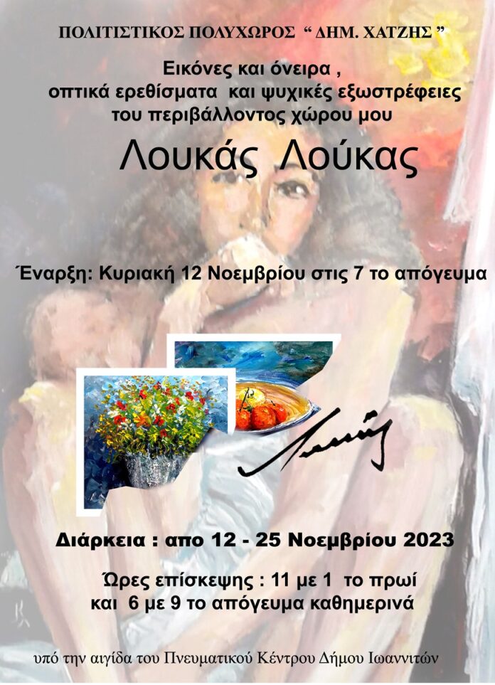 Στον εκθεσιακό χώρο του Πολιτιστικού Πολυχώρου «Δ. Χατζής» θα παρουσιάσει έργα ζωγραφικής του ο γνωστός Γιαννιώτης ζωγράφος Λουκάς Λούκας.