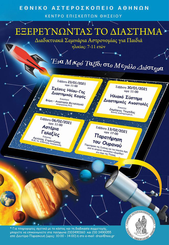 Αυτά είναι μερικά από τα θέματα που θα παρουσιαστούν διαδικτυακά στη σειρά διαδραστικών παραστάσεων του Κέντρου Επισκεπτών Πεντέλης του Εθνικού Αστεροσκοπείου Αθηνών (ΕΑΑ).