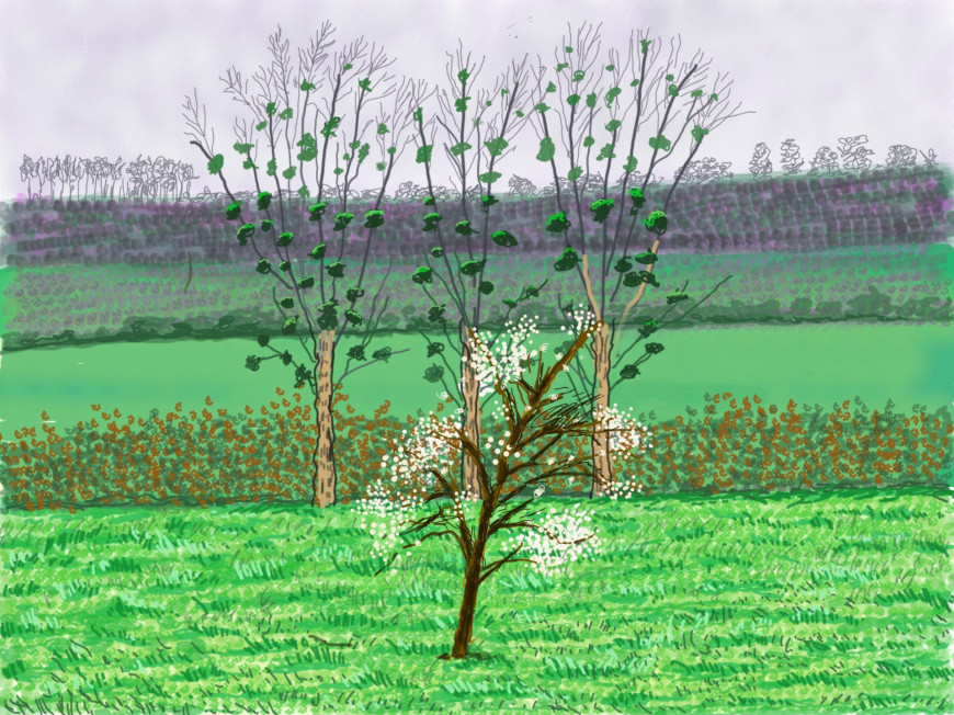 «Βρήκαμε αυτό το σπίτι με ένα μεγάλο κήπο που ήταν φθηνότερο από οτιδήποτε στο Sussex» γράφει ο Χόκνεϊ. Λέει πως το αγόρασαν, το ανακαίνισαν και έχτισαν ένα μικρό στούντιο και ζουν εκεί από τις αρχές Μαρτίου. «Άρχισα να ζωγραφίζω τα δέντρα το χειμώνα σε ένα νέο iPad και τότε άρχισε αυτός ο ιός…».