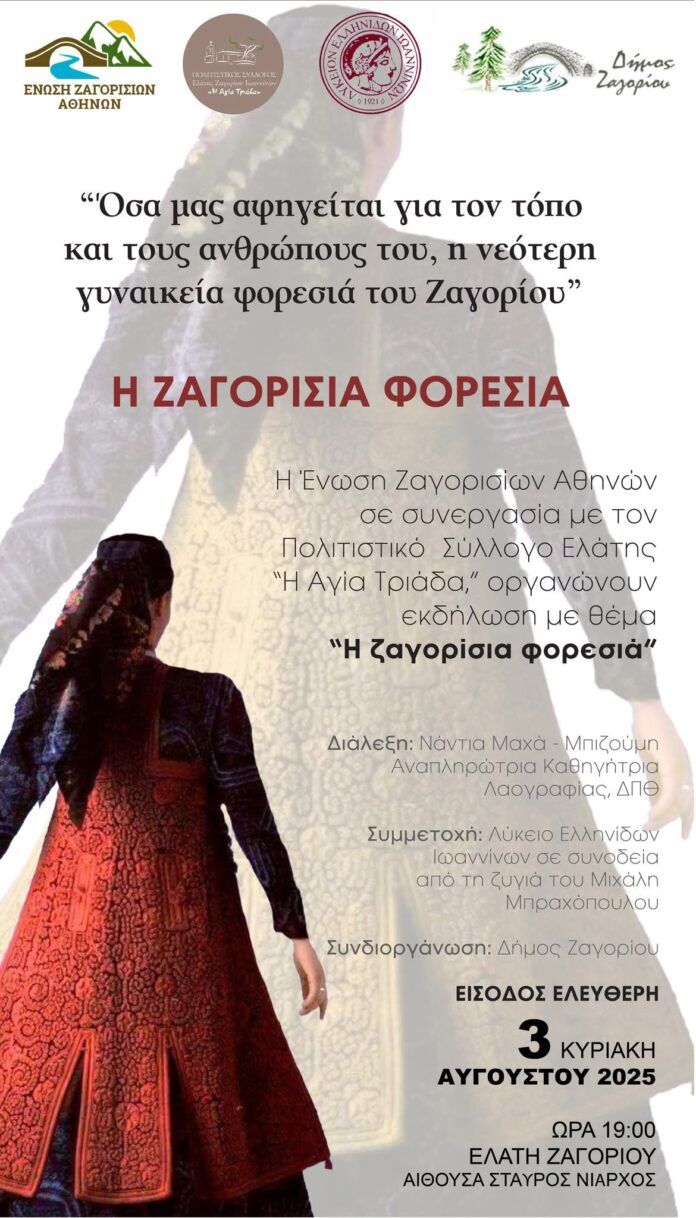 Μια ενδιαφέρουσα πολιτιστική εκδήλωση με τίτλο «Όσα μας αφηγείται για τον τόπο και τους ανθρώπους του, η νεότερη γυναικεία φορεσιά του Ζαγορίου» θα πραγματοποιηθεί την Κυριακή 3 Αυγούστου στην Ελάτη Ζαγορίου. Η εκδήλωση διοργανώνεται με πρωτοβουλία της Ένωσης Ζαγορισίων Αθηνών, σε συνεργασία με τον Πολιτιστικό Σύλλογο Ελάτης “Η Αγία Τριάδα” και με την υποστήριξη του Δήμου Ζαγορίου.