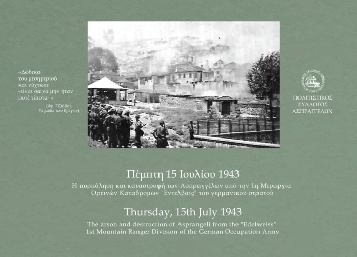 Συγκεκριμένα, την Τρίτη 9 Αυγούστου, θα είναι μια ημέρα αφιερωμένη στη μνήμη της καταστροφής των Ασπραγγέλων από τη Γερμανική Μεραρχία Εντελβάις τον Ιούλιο του 1943.