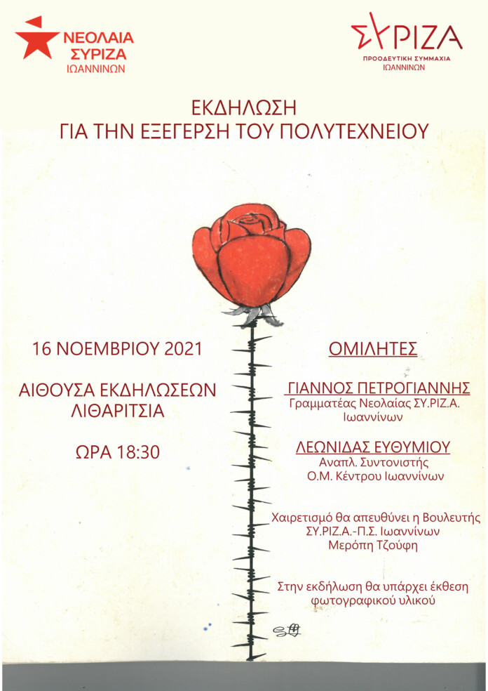 Η νεολαία ΣΥΡΙΖΑ Ιωαννίνων και ο ΣΥΡΙΖΑ-Π.Σ Ιωαννίνων στο πλαίσιο των εκδηλώσεων για την εξέγερση του Πολυτεχνείου το 1973, διοργανώνουν εκδήλωση την Τρίτη 16 Νοέμβρη 2021 και ώρα 18:30 στα Λιθαρίτσια, προς τιμή της νεολαίας και των αγωνιστών που συνέβαλαν αποφασιστικά στην πτώση της ξενόδουλης στρατιωτικής χούντας των συνταγματαρχών.