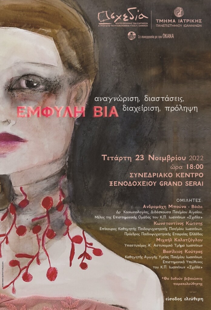 Με αφορμή τη Διεθνή Ημέρα για την Εξάλειψη της Βίας κατά των Γυναικών, το Κέντρο Πρόληψης των Εξαρτήσεων & Προαγωγής της Ψυχοκοινωνικής Υγείας Ν. Ιωαννίνων «Σχεδία» και το Τμήμα Ιατρικής του Πανεπιστημίου Ιωαννίνων, σε συνεργασία με τον ΟΚΑΝΑ, διοργανώνουν ημερίδα με θέμα «Έμφυλη Βία: αναγνώριση, διαστάσεις, διαχείριση, πρόληψη». Η ημερίδα θα πραγματοποιηθεί την Τετάρτη 23 Νοεμβρίου, στις 6 το απόγευμα, στο συνεδριακό κέντρο του ξενοδοχείου Grand Serai.
