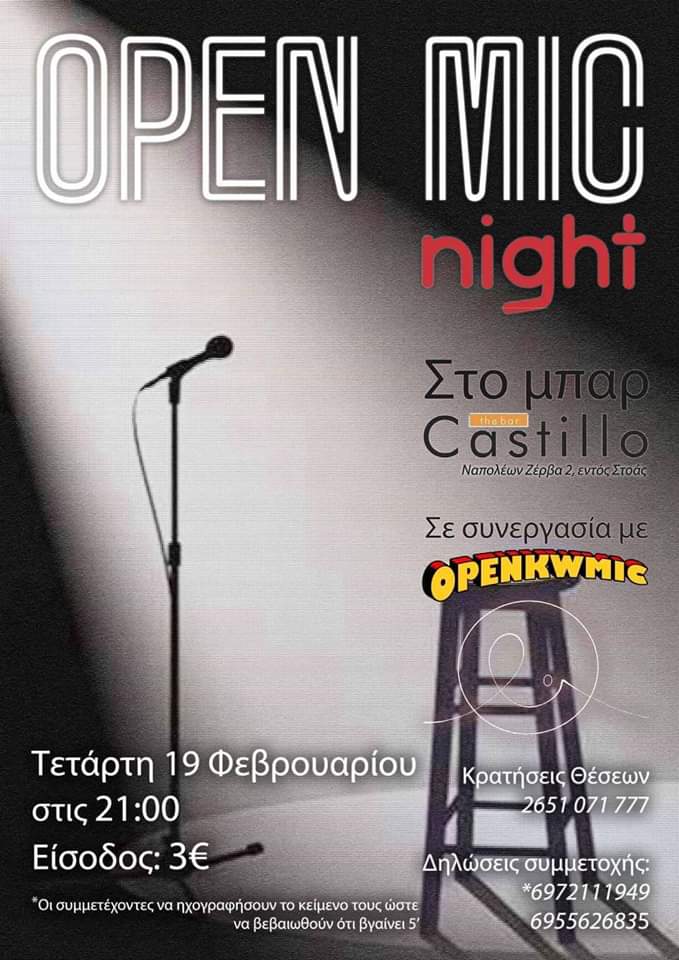 Την Τετάρτη 19/2 βραδιά OPEN MIC στο Castillo bar!