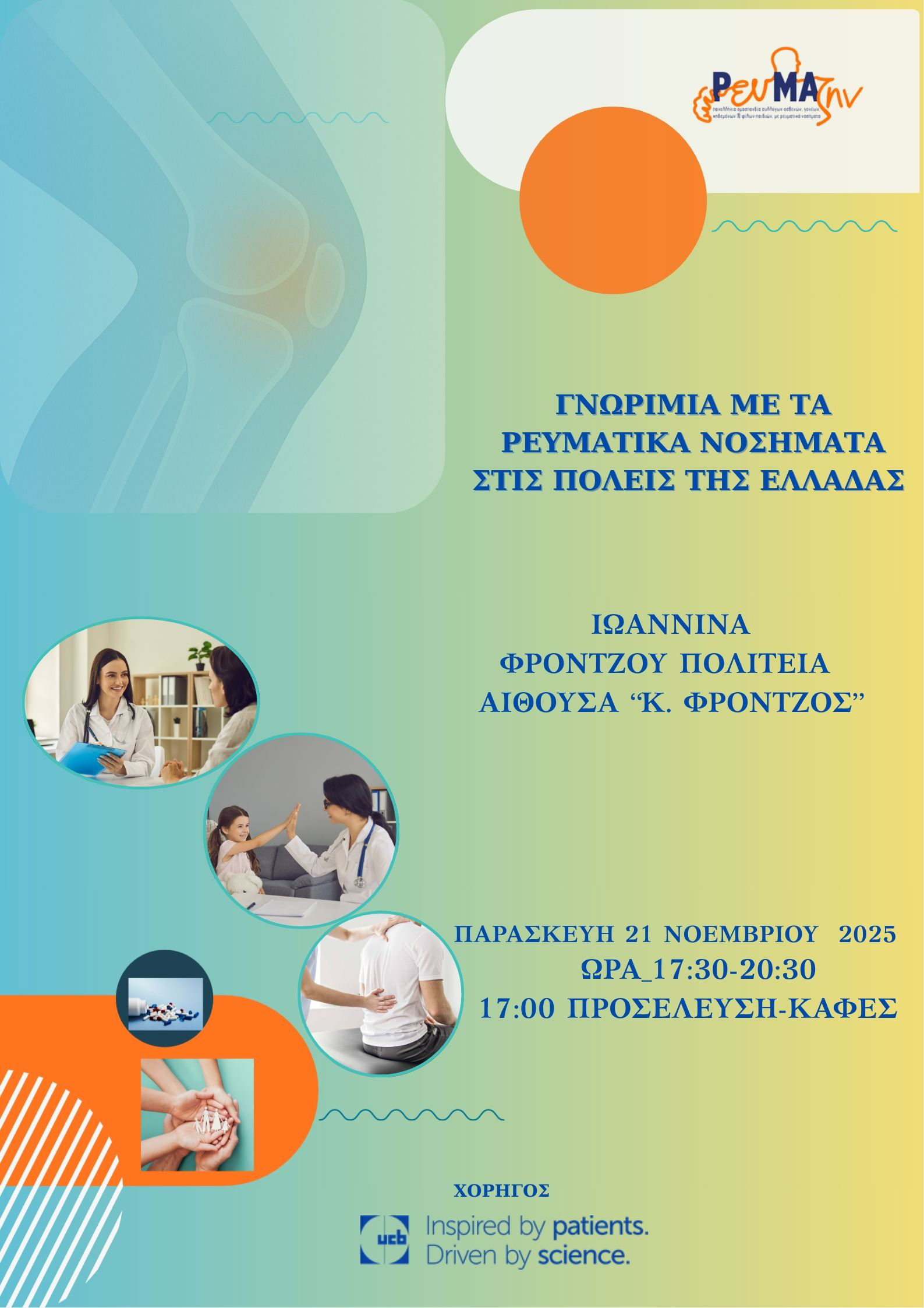 Η Πανελλήνια Ομοσπονδία Ρευμαζήν Συλλόγων ασθενών, γονέων, κηδεμόνων και φίλων παιδιών με ρευματικά νοσήματα «Ρευμαζήν» πραγματοποιεί εκδήλωση με τίτλο «Γνωριμία με τα Ρευματικά Νοσήματα, σε πόλεις της Ελλάδας», στα Ιωάννινα την Παρασκευή 21 Νοεμβρίου, στην Φρόντζου Πολιτεία, αίθουσα «Κώστας Φρόντζος» στις 17.30.