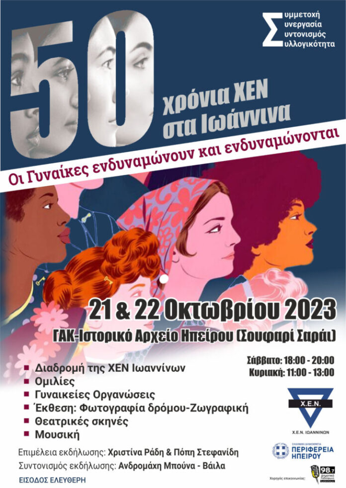 Η Χ.Ε.Ν Ιωαννίνων, σωματείο της Χ.Ε.Ν Ελλάδος, της γυναικείας οργάνωσης που αγωνίζεται για την γυναίκα και το παιδί σε ένα ασφαλές περιβάλλον, τιμά τα 50 χρόνια της στην πόλη μας με μια διήμερη εκδήλωση το Σάββατο 21 Οκτωβρίου (ώρες 18:00- 21:00) και Κυριακή 22 Οκτωβρίου (11:00 -13:00) στον χώρο των ΓΑΚ – Ιστορικό Αρχείο – Μουσείο Ηπείρου (Σουφαρί Σεράι) με τίτλο «50 χρόνια ΧΕΝ στα Ιωάννινα».