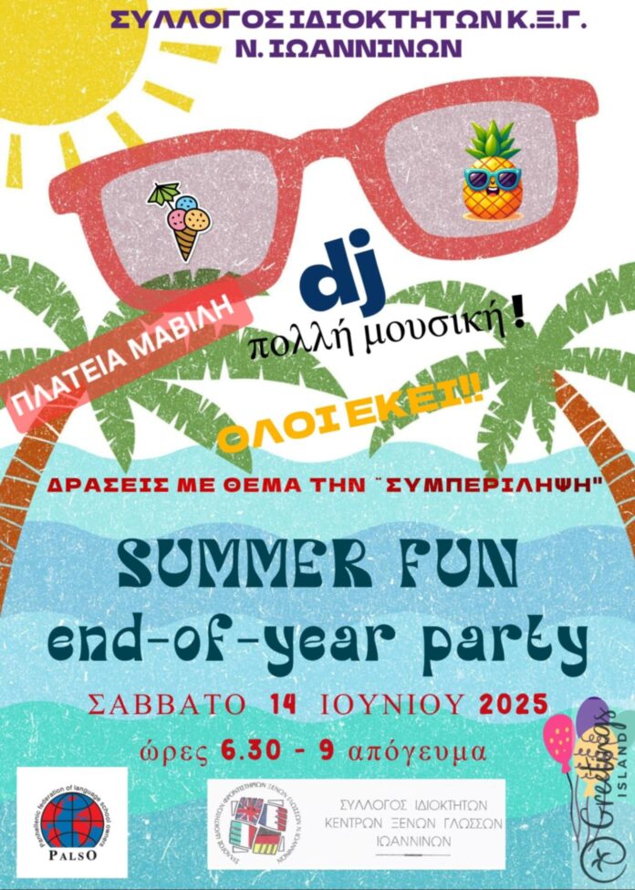 Ο Σύλλογος Ιδιοκτητών Κέντρων Ξένων Γλωσσών PALSO Νομού Ιωαννίνων διοργανώνει την καθιερωμένη καλοκαιρινή εκδήλωση για τους μαθητές των Κέντρων Ξένων Γλωσσών PALSO, το Σάββατο 14 Ιουνίου, από τις 18:30 έως τις 21:00, στην Πλατεία Μαβίλη.