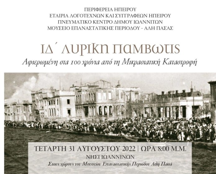 Την Τετάρτη 31 Αυγούστου, στις 8 το βράδυ, θα γίνει η εκδήλωση που είναι αφιερωμένη στα 100 χρόνια από την Μικρασιατική Καταστροφή από την Λυρική Παμβώτιδα.