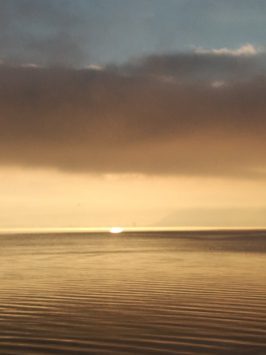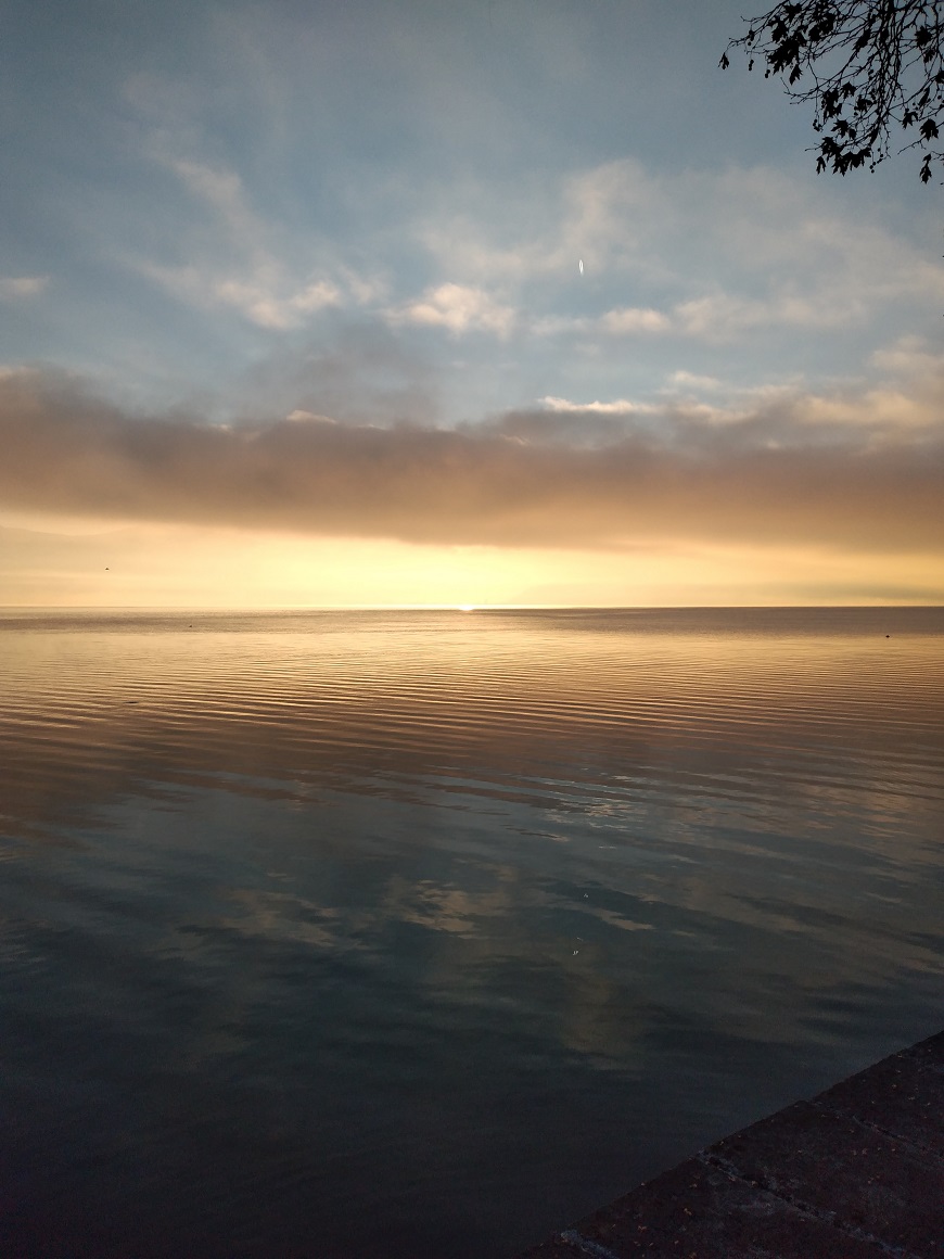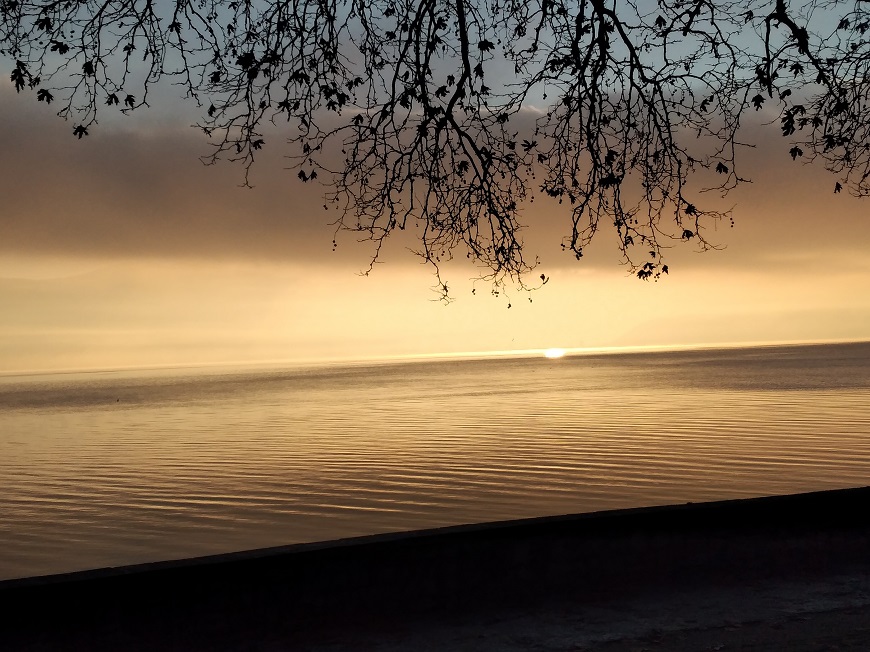 Νωρίς το πρωί, με τον ήλιο να προσπαθεί να βγει πάνω από το χαμηλό σύννεφο, οι ακτίνες και η φωτεινότητά του πέρασαν κάτω από το υπόστρωμα νέφους και δημιούργησαν μία λάμψη στην επιφάνεια των νερών της Παμβώτιδας.