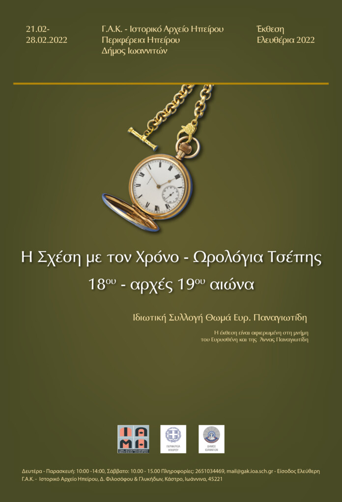 Η Έκθεση: «Η Σχέση με τον Χρόνο – Ωρολόγια τσέπης 18ου – αρχές 19ου αιώνα» Συλλογή Θωμά Ευρ. Παναγιωτίδη, θα παρουσιάζεται από τις 21 Φεβρουαρίου έως τις 28 Φεβρουαρίου, στα Γ.Α.Κ.- Ιστορικό Αρχείο Ηπείρου.