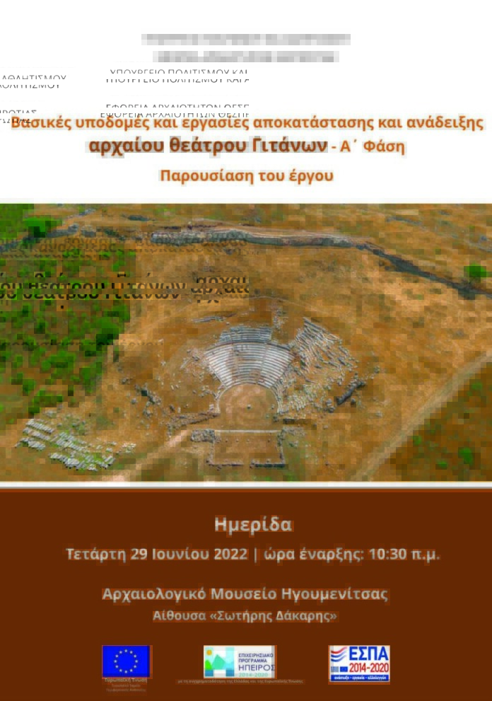 Η Εφορεία Αρχαιοτήτων Θεσπρωτίας διοργανώνει την Τετάρτη 29 Ιουνίου και ώρα 10.30 π.μ. στο Αρχαιολογικό Μουσείο Ηγουμενίτσας, ανοιχτή για το κοινό ενημερωτική Ημερίδα για την ολοκλήρωση των εργασιών αποκατάστασης και ανάδειξης του αρχαίου θεάτρου Γιτάνων.