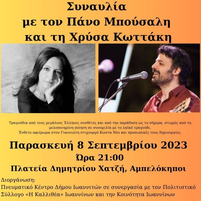 Οι αγαπημένοι καλλιτέχνες θα ερμηνεύσουν τραγούδια από τους μεγάλους Έλληνες συνθέτες και από την παράδοση ως το σήμερα, στιγμές από τη μελοποιημένη ποίηση σε συνομιλία με το λαϊκό τραγούδι. Επίσης θα γίνει ένα μικρό αφιέρωμα στον Γιαννιώτη στιχουργό Κώστα Νέο αλλά και σε προσωπικές τους δημιουργίες.