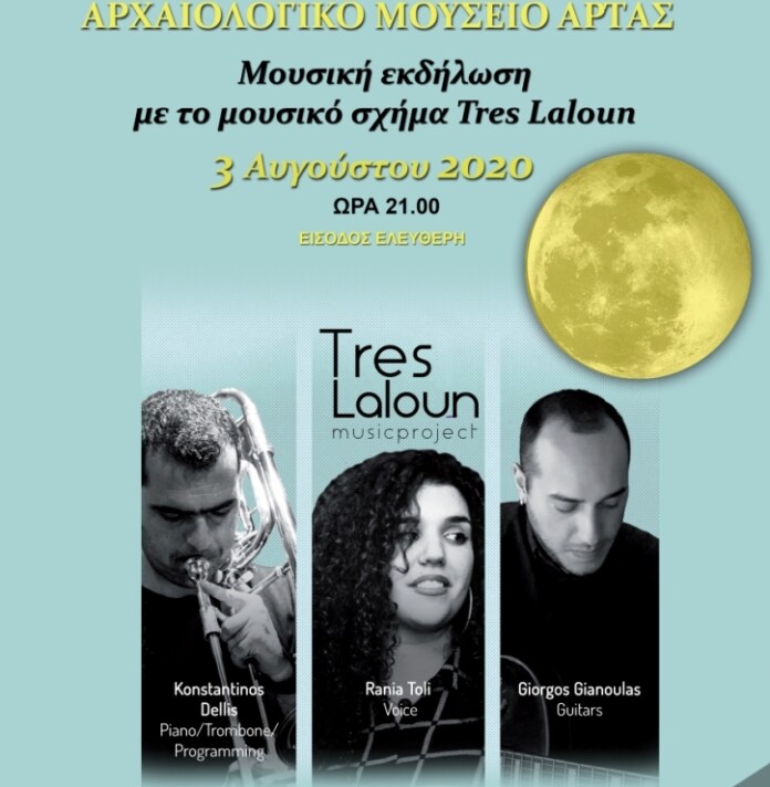Η Εφορεία Αρχαιοτήτων Άρτας διοργανώνει μουσική εκδήλωση με το μουσικό σχήμα TresLaloun στο Αρχαιολογικό Μουσείο Άρτας τη Δευτέρα 3 Αυγούστου στις 21:00.