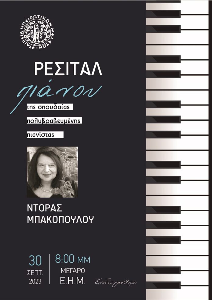 Η πρεμιέρα των χειμερινών εκδηλώσεων θα γίνει το Σάββατο, 30 Σεπτεμβρίου στις 20.00, στην «Αίθουσα Κ. Κατσάρη» του Μεγάρου της Ε.Η.Μ. με το Ρεσιτάλ πιάνου της πολυβραβευμένης πιανίστα, Ντόρας Μπακοπούλου.