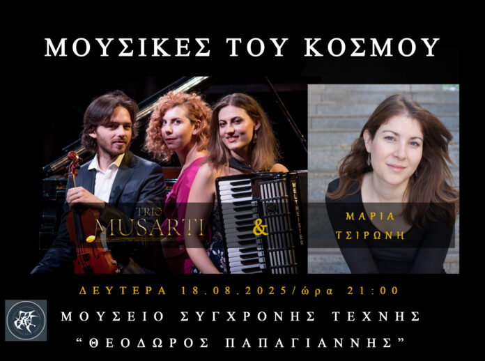 Μουσική βραδιά με τίτλο «Μουσικές του Κόσμου» με το Τrio Musarti και τη Σοπράνο Μαρία Τσιρώνη στις 18 Αυγούστου, στις 21:00, στον αύλειο χώρο του Μουσείου Σύγχρονης Τέχνης «Θ. Παπαγιάννης», στο Ελληνικό, στο πλαίσιο του 15ου συμπόσιου γλυπτική.