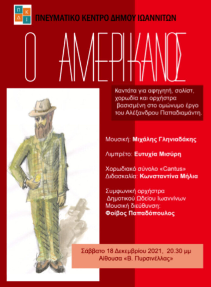 Το Πνευματικό Κέντρο Δήμου Ιωαννιτών παρουσιάζει το Σάββατο 18 Δεκεμβρίου και ώρα 20:30, στην αίθουσα «Β. Πυρσινέλλας» με τη Συμφωνική Ορχήστρα την καντάτα για αφηγητή, σολίστ, χορωδία και ορχήστρα βασισμένη στο ομώνυμο έργο του Αλέξανδρου Παπαδιαμάντη.