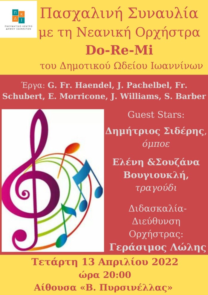 Η Νεανική Ορχήστρα Do-Re-Mi του Δημοτικού Ωδείου Ιωαννίνων παρουσιάζει την Τετάρτη 13 Απριλίου 2022 και ώρα 20:00, στην αίθουσα «Β. Πυρσινέλλας την πασχαλινή της συναυλία με έργα G. Fr. Haendel, J. Pachelbel, Fr. Schubert, EJ. Williams, S. Barber, κ.ά