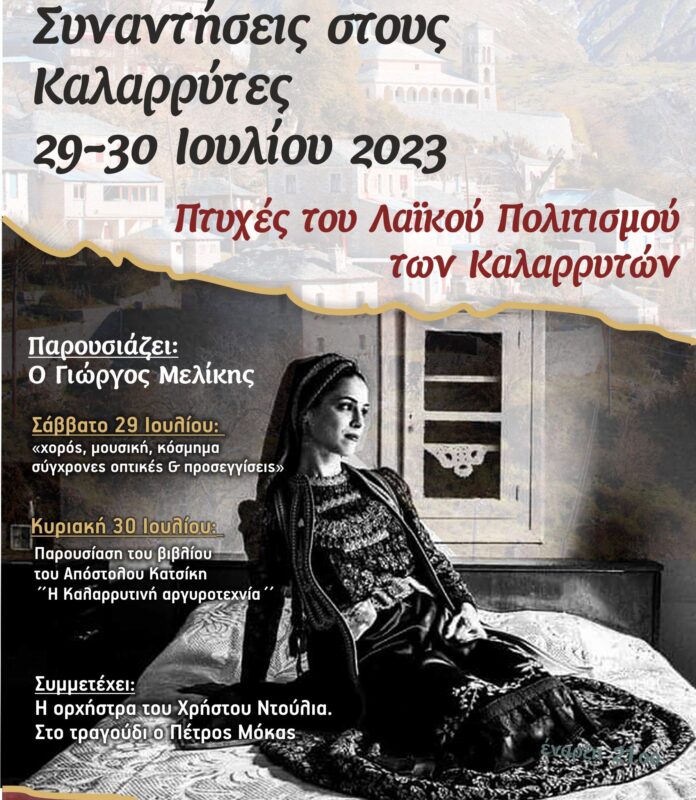 Ο Πατριωτικός Σύνδεσμος Καλαρρυτών «Η Πίνδος», συνδιοργανώνει με την Περιφέρεια Ηπείρου και τον Δήμο Βορείων Τζουμέρκων διήμερο εκδηλώσεων με τίτλο: «Πτυχές του λαϊκού πολιτισμού των Καλαρρυτών», στα πλαίσια του κύκλου πολιτιστικών δράσεων «Συναντήσεις στους Καλαρρύτες».