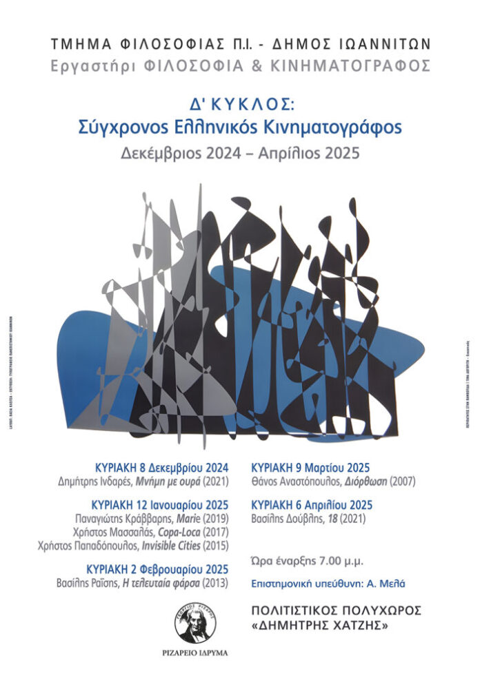 Το Τμήμα Φιλοσοφίας του Πανεπιστημίου Ιωαννίνων και ο Δήμος Ιωανιτών στο πλαίσιο του τέταρτου κύκλου της δράσης «Εργαστήρι Φιλοσοφία και Κινηματογράφος» παρουσιάζουν ένα αφιέρωμα στο σύγχρονο ελληνικό κινηματογράφο, στον Πολιτιστικό Πολυχώρο «Δ. Χατζής» (ώρα έναρξης: 19:00).