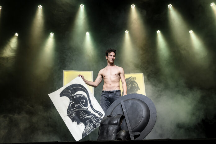 Ο Μιχάλης Σαράντης ερμηνεύει συγκλονιστικά και τους εννιά ρόλους της τραγωδίας, ενώ ο Απόστολος Χαντζαράς συνομιλεί μαζί του ζωγραφίζοντας, μπροστά στα μάτια των θεατών.