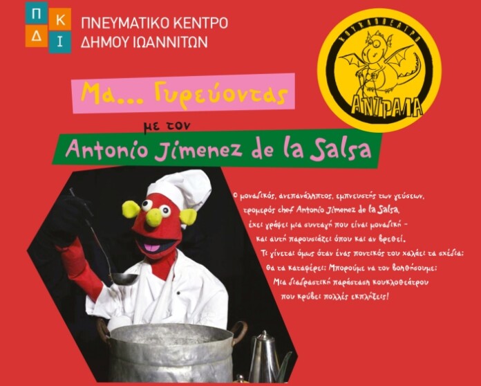 Το Πνευματικό Κέντρο Δήμου Ιωαννιτών και το Κουκλοθέατρο Αντράλα παρουσιάζουν την Παρασκευή 31 Ιουλίου στις 21:00, στον Αύλειο Χώρο του Πολιτιστικού Πολυχώρου «Δ. Χατζής» μια παράσταση κουκλοθεάτρου με τίτλο: «Μα… Γυρεύοντας με τον Antonio Jimenez de la Salsa»