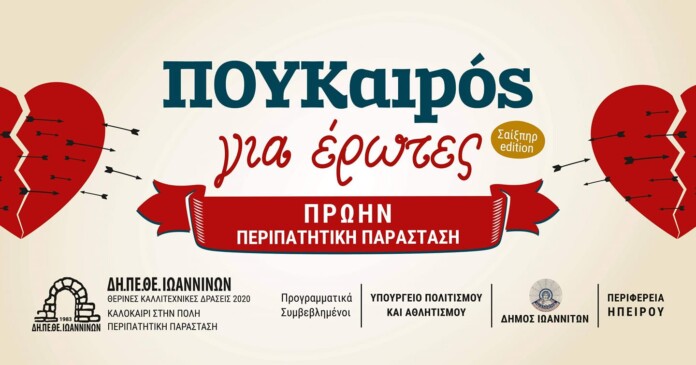 Συγκεκριμένα από τη Δευτέρα 24 Αυγούστου και κάθε μέρα, η παράσταση «ΠΟΥΚαιρός για έρωτες» του ΔΗΠΕΘΕ Ιωαννίνων και του σχήματος «Συν Πλην Τρία», συνεχίζονται στον αύλειο χώρο του Αρχοντικού Πυρσινέλλα.