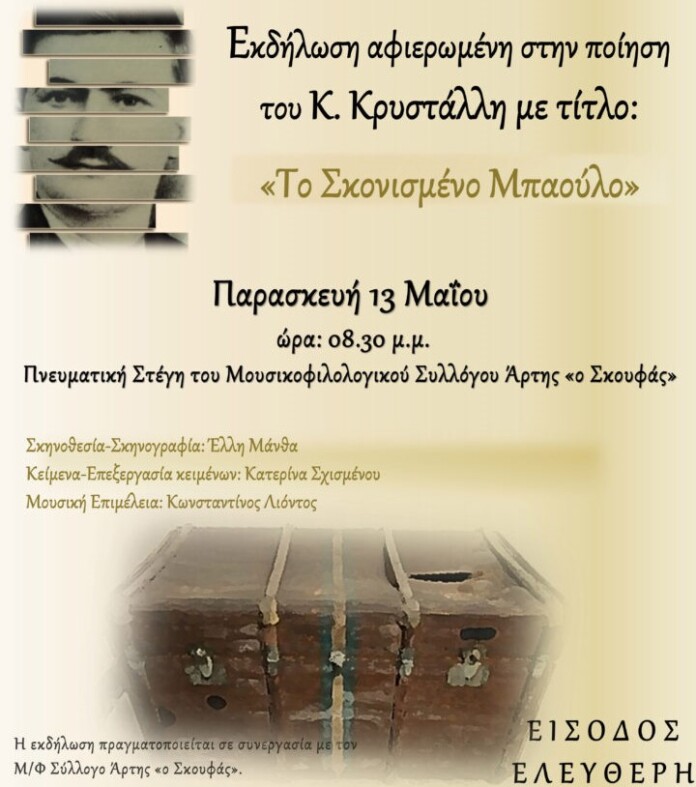 Η εκδήλωση θα πραγματοποιηθεί στην πνευματική στέγη του Μουσικοφιλολογικού Συλλόγου Άρτας «ο Σκουφάς» και ώρα 20:30 και στο πρώτο μέρος θα παρουσιαστεί η θεατρική παράσταση με τίτλο «Το Σκονισμένο Μπαούλο», από την Θεατρική Ομάδα των Εφήβων Hermes, σε κείμενα από την φιλόλογο Κατερίνα Σχισμένου και καθοδήγηση-σκηνοθεσία από την σκηνοθέτη/ηθοποιό Έλλη Μάνθα. Στο δεύτερο και τελευταίο μέρος της εκδήλωσης θα ακολουθήσουν χαιρετισμοί και συζήτηση με κύριο άξονα τη ζωή και το έργο του ποιητή.