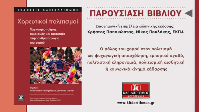 Την Τετάρτη 12 Φεβρουαρίου στις 20.00 το βράδυ στο φουαγέ του Πνευματικού Κέντρου του Δήμου Ιωαννιτών, το Δίκτυο Χορού, οι εκδόσεις ΚΛΕΙΔΑΡΙΘΜΟΣ και το βιβλιοπωλείο Μιχάλη Μάντζιου θα παρουσιάσουν το βιβλίο «ΧΟΡΕΥΤΙΚΟΙ ΠΟΛΙΤΙΣΜΟΙ παγκοσμιοποίηση, τουρισμός και ταυτότητα στην ανθρωπολογία του χορού», των H.N Kringelbach & J.Skinner.