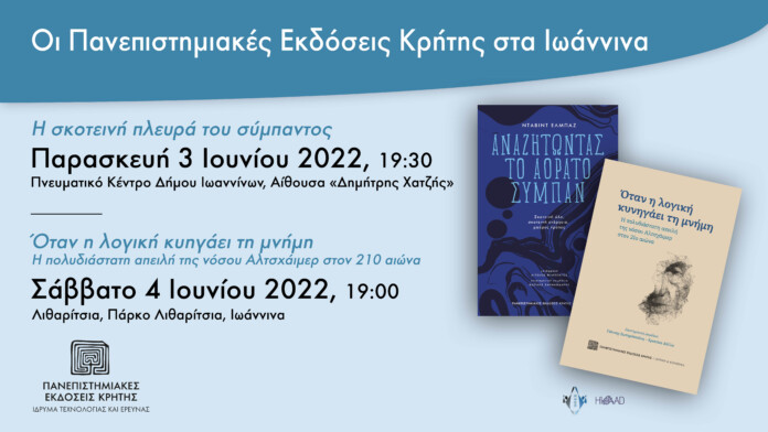 Οι Πανεπιστημιακές Εκδόσεις Κρήτης, η Εταιρεία Ψυχοκοινωνικής Έρευνας και Παρέμβασης – Ε.Ψ.Ε.Π. Ιωαννίνων και η «Ελληνική Πρωτοβουλία ενάντια στην Αλτσχάιμερ» με αφορμή την έκδοση του βιβλίου Όταν η λογική κυνηγάει τη μνήμη. Η πολυδιάστατη απειλή της νόσου Αλτσχάιμερ στον 21ο αιώνα διοργανώνουν το Σάββατο 4 Ιουνίου 2022 συζήτηση σχετικά με τη φαρμακευτική αντιμετώπιση της νόσου Αλτσχάιμερ, τη φροντίδα των ατόμων με άνοια και το ρόλο του Κέντρου Ημέρας στην κοινότητα, τη διαγνωστική και θεραπευτική προσέγγιση της άνοιας και το ρόλο της επικοινωνίας και της καλής φυσικής κατάστασης.