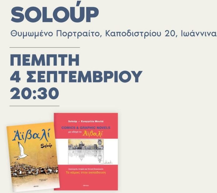 Παρουσιάζεται την Πέμπτη 4 Σεπτεμβρίου, στις 20.30, στο Θυμωμένο Πορτραίτο (Καποδιστρίου 20), η επανέκδοση του graphic novel «Αϊβαλί» του Soloup και η μελέτη των Soloup και Ευαγγελίας Μουλά «Comics και Graphic novels με οδηγό το Αϊβαλί. Λογοτεχνία, Ιστορία και Οπτική επικοινωνία», από τις εκδόσεις Διόπτρα.