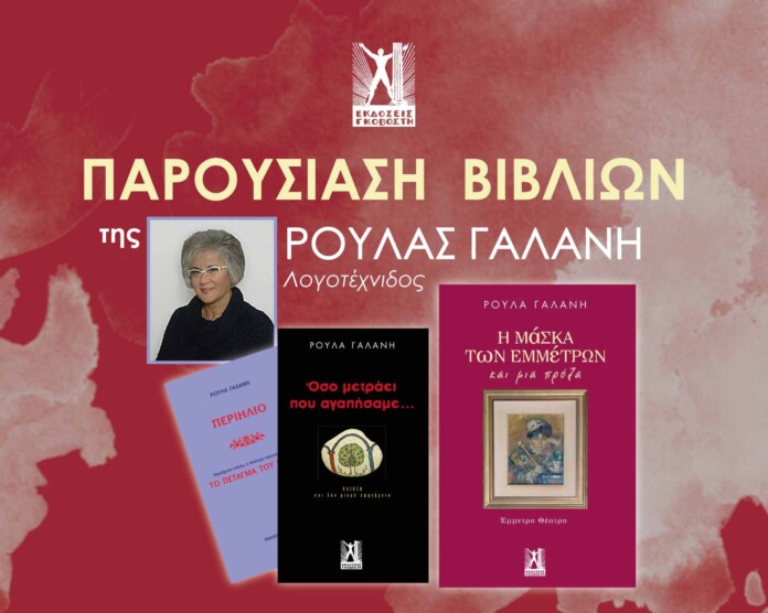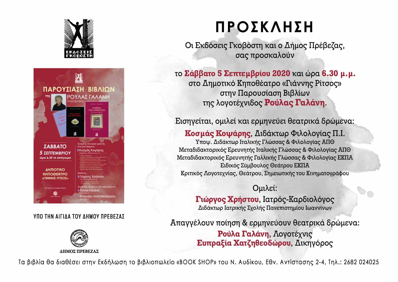 Στο Δημοτικο Κηποθέατρο «Γιάννης Ρίτσος» στην Πρέβεζα θα πραγματοποιηθεί το Σάββατο 5 Σεπτεμβρίου στις 6:30 μ.μ. η παρουσίαση των βιβλίων της Ρούλας Γαλάνη.