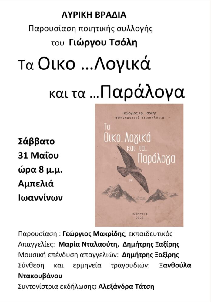 Το Σάββατο 31 Μαΐου στην αίθουσα του Πνευματικού Κέντρου Αμπελιάς θα πραγματοποιηθεί η παρουσίαση της ποιητικής συλλογής του Γιώργου Τσόλη με τίτλο «Τα Οικο…λογικά και τα… Παράλογα». Πρόκειται για ποιήματα που έχουν αφηγηματική δομή, συνταιριάζοντας εικόνες ακούσματα και φαντασία, για να υμνήσουν τον έρωτα, τη φύση, τις τέχνες και τα γράμματα.