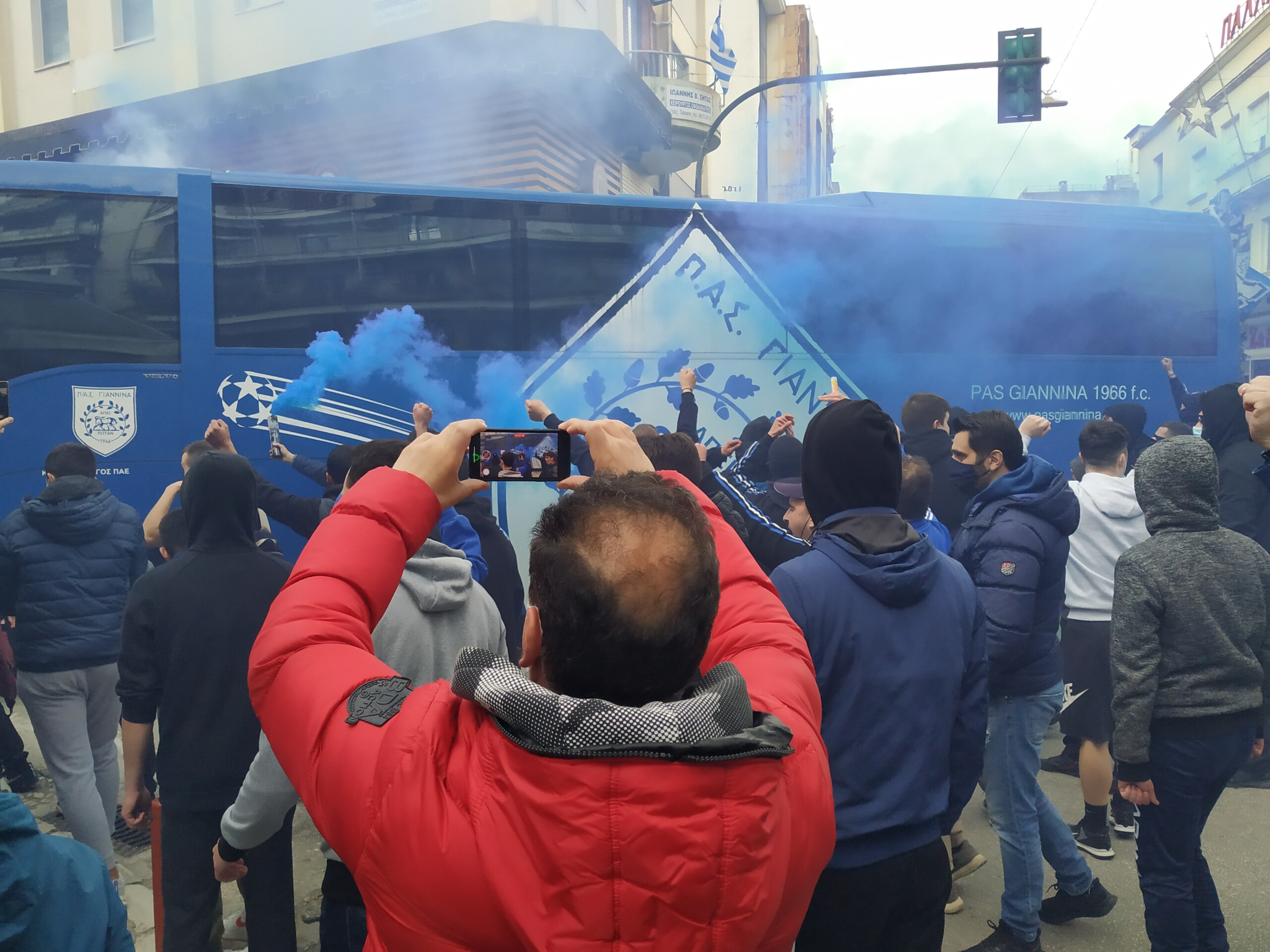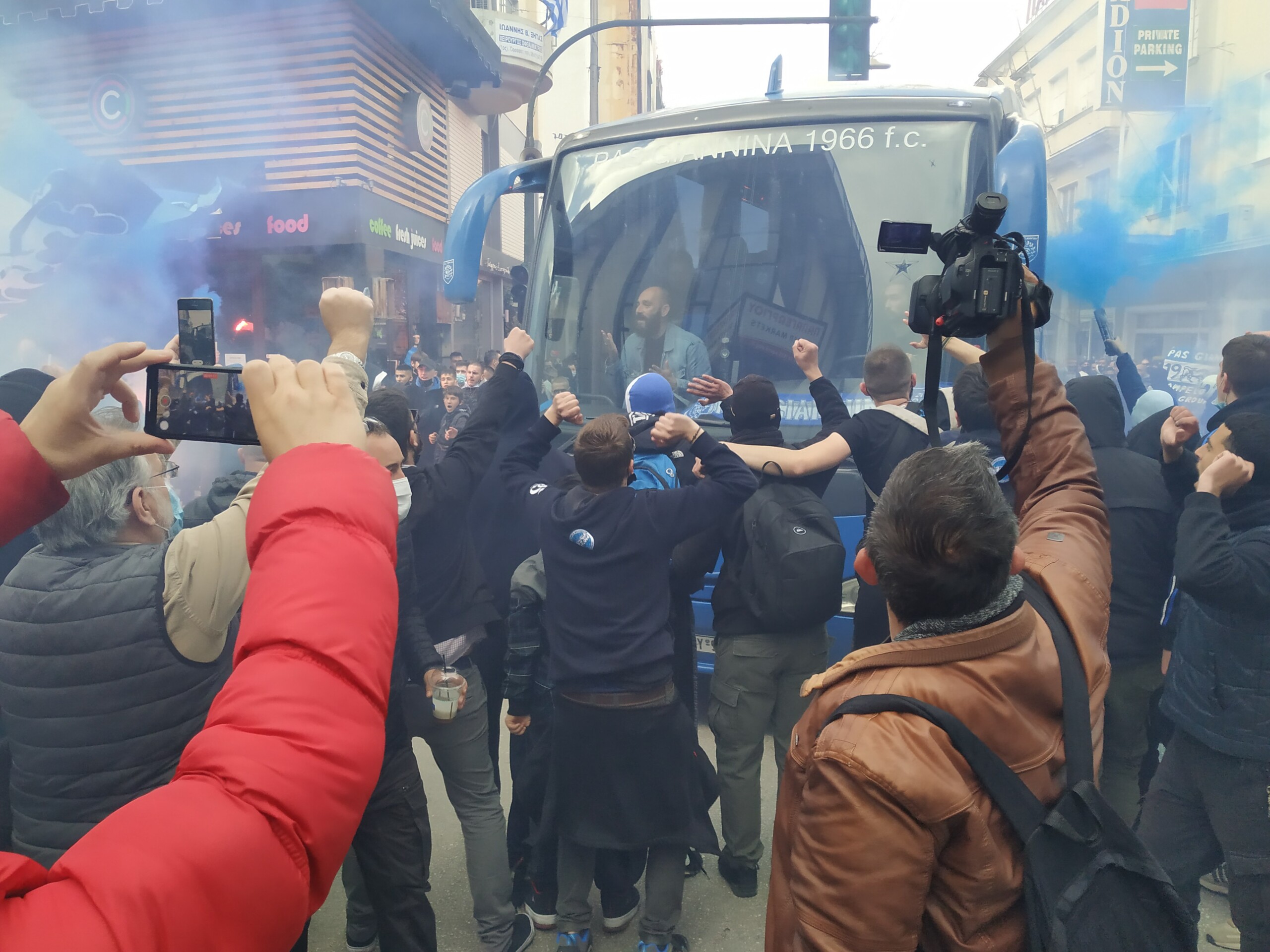 Μπορεί να μην επιτρέπεται να δώσουν το «παρών» μέσα στο γήπεδο, ωστόσο, αποθεωτική ήταν η υποδοχή που επεφύλαξαν στη αποστολή του ΠΑΣ Γιάννινα εκατοντάδες φίλαθλοι της ομάδας κατά την άφιξή της στους «Ζωσιμάδες» για τον πρώτο ημιτελικό του κυπέλλου με αντίπαλο τον Ολυμπιακό.