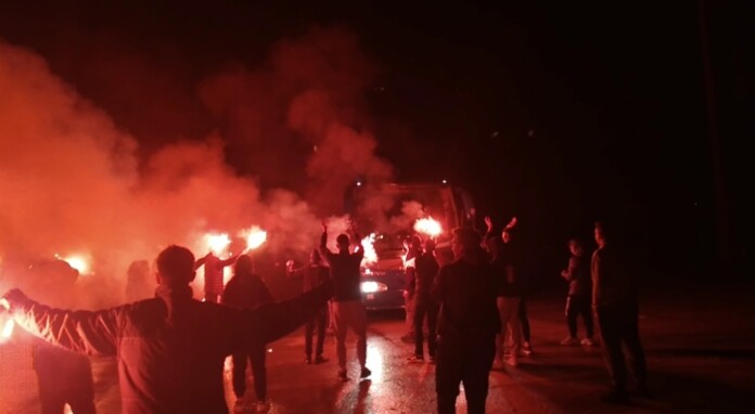 Δεκάδες φίλοι του ΠΑΣ αποθέωσαν τα μεσάνυχτα την αποστολή του ΠΑΣ στην επιστροφή της από το «σφαγείο» της διαιτησίας.