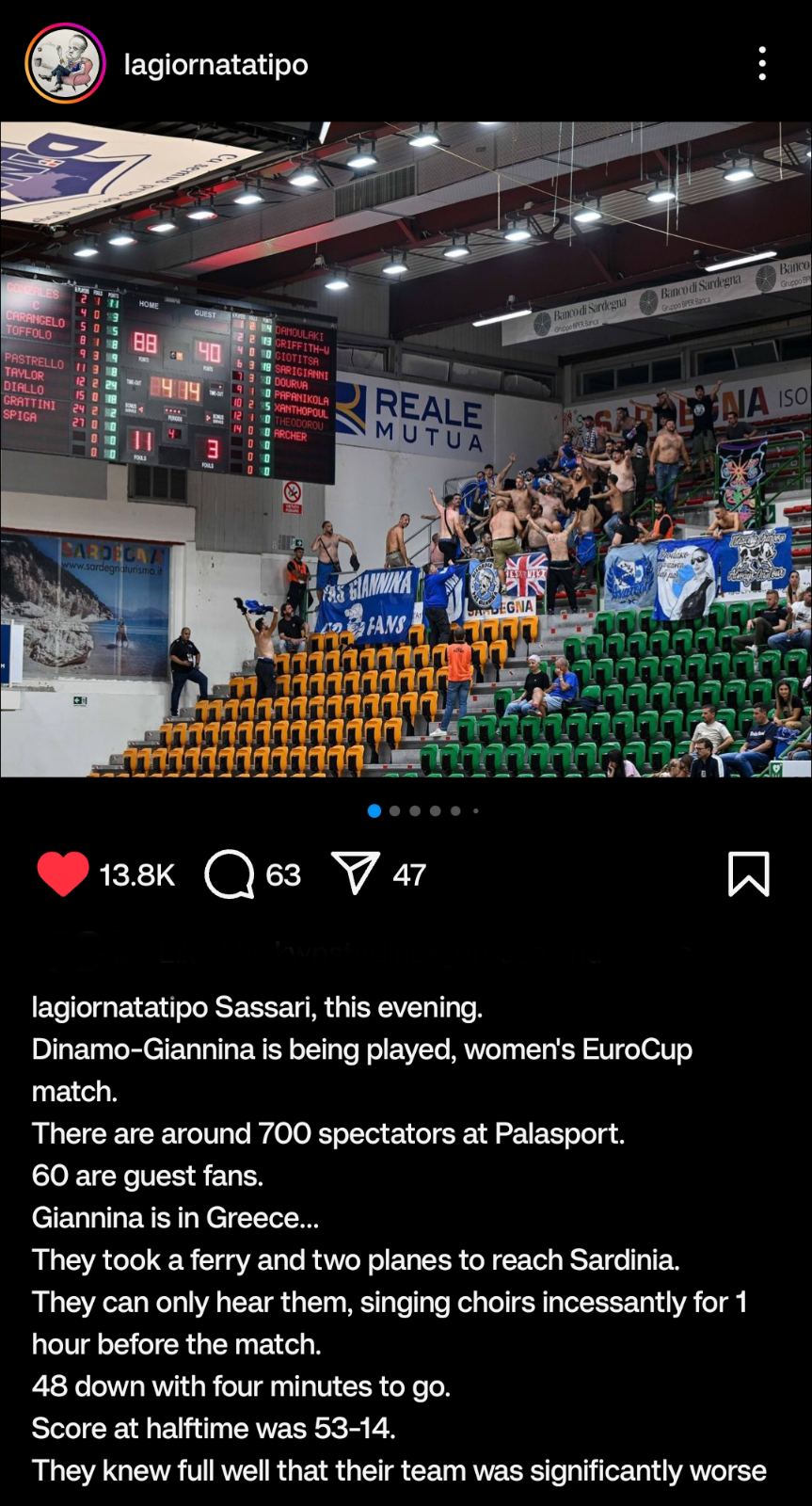 «Σάσσαρι, απόψε. Παίζουν Ντιναμό – ΠΑΣ ΓΙΑΝΝΙΝΑ για το Eurocup Γυναικών. Υπάρχουν περίπου 700 θεατές στο γήπεδο. Οι 60 είναι φιλοξενούμενοι οπαδοί. Τα Γιάννενα βρίσκονται στην Ελλάδα. Πήραν ένα πλοίο και δύο αεροπλάνα για να φτάσουν στη Σαρδηνία. Ακούγονται μόνον αυτοί… Τραγουδούν ασταμάτητα μία ώρα πριν τον αγώνα. Είναι πίσω με 43 πόντους τέσσερα λεπτά πριν τη λήξη. Το σκορ στο ημίχρονο ήταν 53-14. Γνώριζαν πολύ καλά πως η ομάδα τους είναι πιο αδύναμη από τη Ντιναμό. Δεν τους ενδιαφέρει. 26 ώρες ταξίδι εκτός έδρας, την Τετάρτη. Πήγαν για κολύμπι στο Αλγκέρο και μετά ήπιαν εκατοντάδες τενεκεδάκια (σ.σ μπύρες, ποτά κ.λπ) στο κέντρο του Σάσσαρι. Μόνο για να στηρίξουν τα κορίτσια τους. Ήρωες.