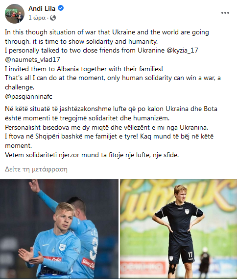Ο πρώην παίκτης του ΠΑΣ ΓΙΑΝΝΙΝΑ, Άντι Λίλα, με ανάρτησή του γνωστοποίησε, ότι επικοινώνησε με τους δύο πρώην συμπαίκτες του στον ΠΑΣ, τους Ουκρανούς Βλάντισλαβ Νάουμετς και Όρεστ Κούζικ, αντίστοιχα, τους οποίους προσκάλεσε μαζί με τις οικογένειές τους, να μεταβούν στην Αλβανία για να τους φιλοξενήσει! Ο Άντι Λίλα αναφέρει στο μήνυμά του, πως «σε αυτήν την κατάσταση πολέμου που περνά η Ουκρανία και ο κόσμος, ήρθε η ώρα να δείξουμε όλοι ανθρωπιά και αλληλεγγύη.